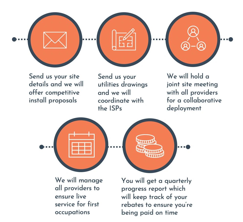 We project manage end-to-end from inception to site completion. We'll offer several competitive proposals and will coordinate the provision for all ISPs ensuring live service for each home prior occupation.